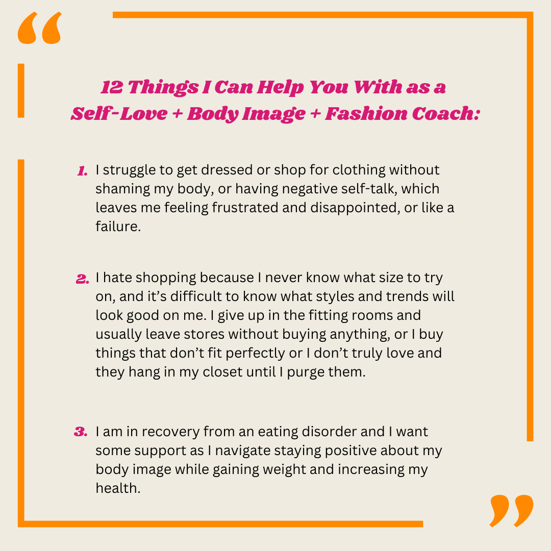 Combined with my many years of experience and education in the fashion industry, my licence from The Body Positive Institute allows me to be highly effective, because I am listening deeply to my own intuitive wisdom about how to help you live with more joy and confidence in your body.
