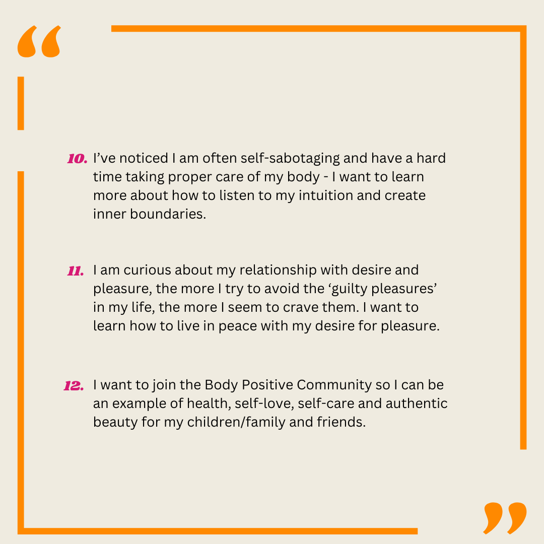 My ideal client is someone who feels disconnected from their body, whether due to years of dieting, internalized shame, or societal pressures. They are ready to move beyond quick fixes and are seeking a deeper, more sustainable transformation. This person values self-exploration and is open to challenging the systems and beliefs that have shaped their relationship with their body.